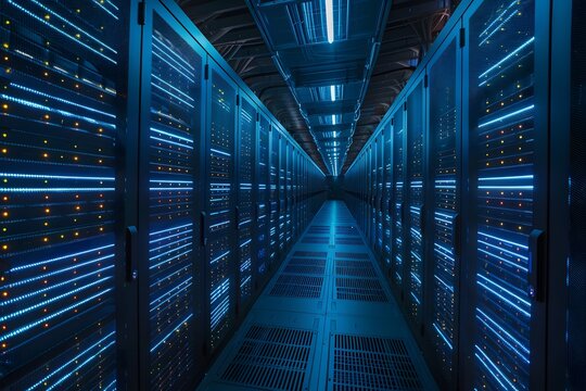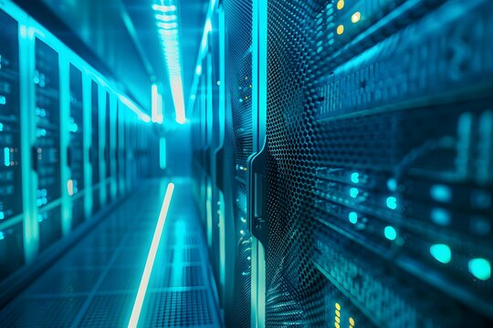 High-tech data center with rows of advanced computer graphics, glowing blue lights illuminating the scene, symmetrical composition showcasing modern technology and security features, high-resolution