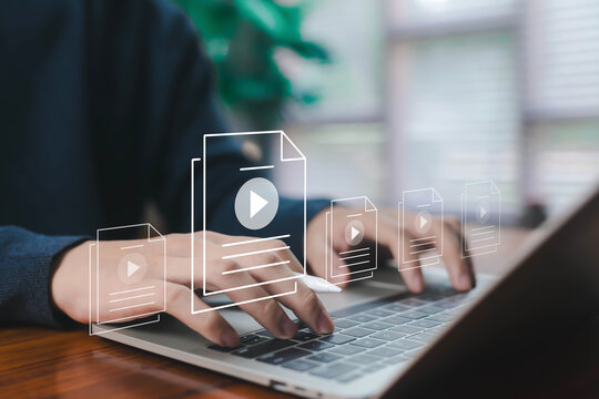 Hands typing on a laptop with floating video file icons represent digital content creation, online media management, video production, multimedia workflow, and modern content marketing strategies.