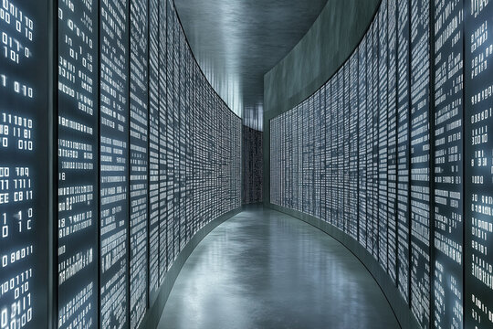 Mysterious Figure in a Dark Data Center with Email Symbols on a Wall, a Futuristic Cyberpunk Scene