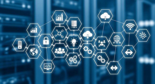 Interconnected network icons displayed over blurred server racks, illustrating data storage, cloud computing, and global connectivity.