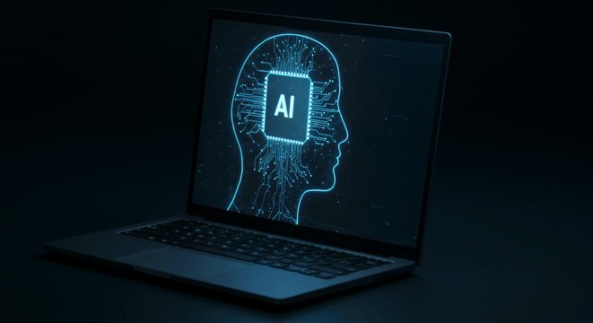Glowing artificial intelligence brain silhouette with AI chip and circuit pathways on dark laptop screen representing machine learning neural network technology
