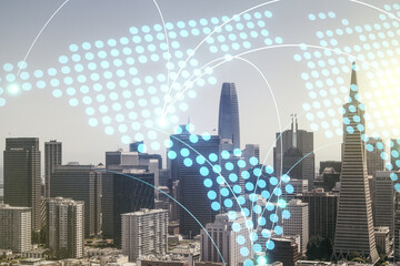 Abstract virtual world map with connections on San Francisco skyline background, international trading concept. Multiexposure