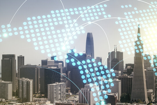 Abstract graphic digital world map hologram with connections on San Francisco cityscape background, globalization concept. Multiexposure