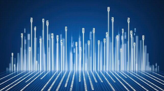 Glowing blue digital data visualization with bar graph and illuminated grid lines in a futuristic technology environment