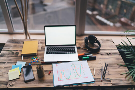 Top view of workspace with graph and laptop illustrates modern freelancer's analytical process, combining data visualization, creative work, and digital planning for remote productivity.