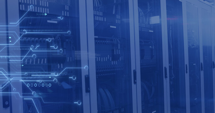 Image of data processing and network of connections over server room