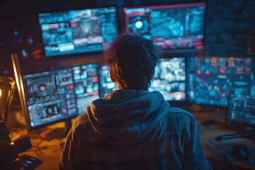 Cybersecurity expert monitoring a threat detection dashboard, cybersecurity concept