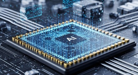 Dynamic businessman interacts with glowing AI chip, visualizing data streams and digital transformation for future innovation.