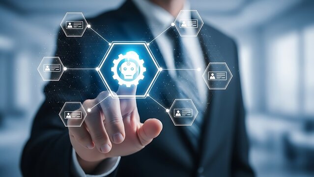 A businessman interacting with a futuristic digital interface in a modern office setting with glowing blue and white holographic projections