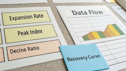 Visual representation of business metrics including expansion rate, peak index, decline ratio, and recovery curve on a data flow chart