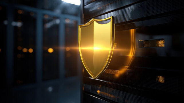 Golden shield icon glowing shield security symbol data protection server rack digital security cybersecurity technology concept network protection