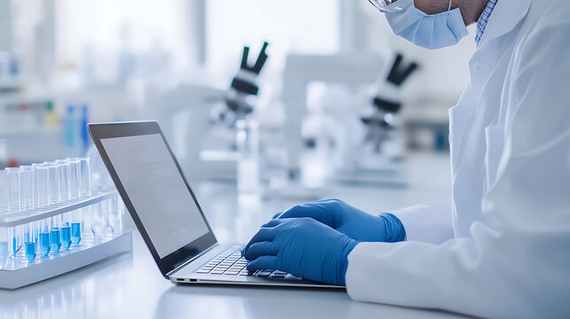 Researcher analyzes data at a lab. Scientist in protective gear working on a laptop, enhancing research and innovations in the scientific field.