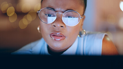 Night, reflection and business woman with glasses in office for overtime work, report deadline or planning. Professional, graphs and analyst with laptop for market research, reading or data analysis