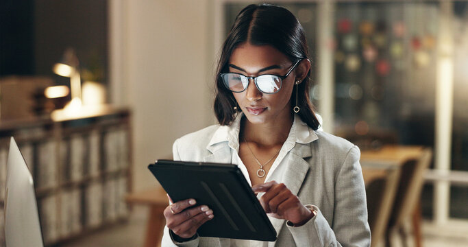Tablet, overtime and businesswoman in office with glasses, reading email or social media post scroll, schedule or report. Planning, research and woman, late at night work and reflection of website.
