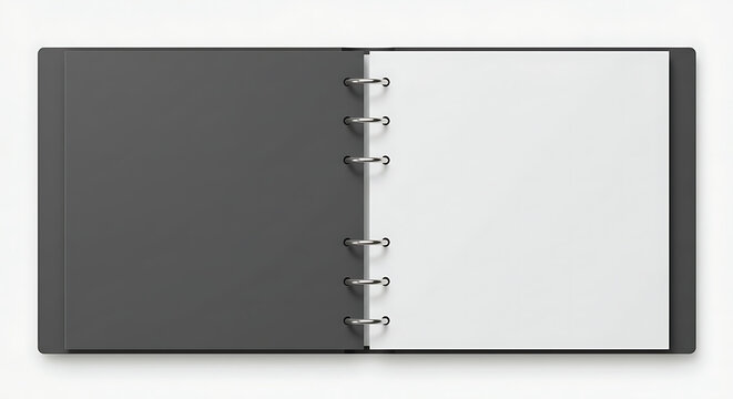 Top view of an open ring binder with blank white pages. Office stationery concept for business organization and planning.