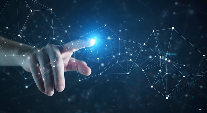 Human Hand Touching Glowing Digital Network Connection Wireframe on Futuristic Blue Background