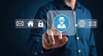 3D Human Finger Pressing AI Vision Icon with Glowing Digital Eye and Cyber Interface