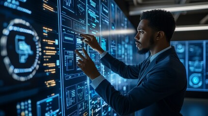 Focused Black Male Technologist Analyzing Information on a Big Data Screen. Tech Innovation