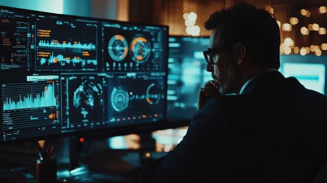 Focused man analyzing global data on monitors.