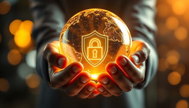 Hands holding glowing digital globe with shield and padlock security symbol earth world