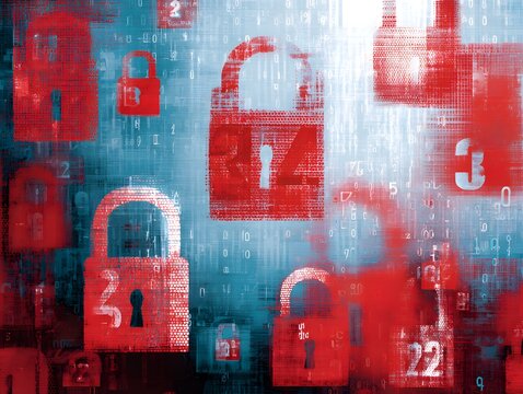 Digital data protection concept with numerous red padlocks symbolizing cybersecurity and information privacy in a network environment