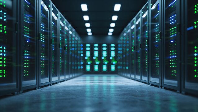 A modern data center showcases rows of powerful servers in a high-tech environment, evoking a sense of technological advancement. Reflective flooring and bright lighting enhance the sleek.