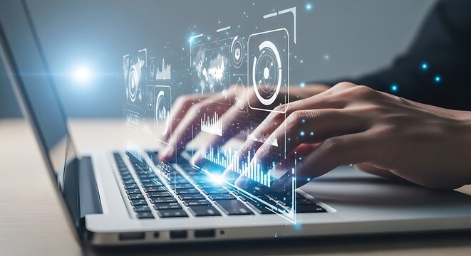 Hands typing on a laptop with futuristic digital data visualizations and glowing analytics overlays