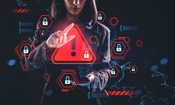 Woman interacting with cybersecurity alert hologram showing warning triangle and padlock symbols in digital interface concept on dark background..