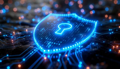 Cyber Shield Sentinel: A glowing shield, illuminated with a futuristic blue light, stands as a vigilant guardian amidst a sea of digital darkness. The beacon symbolizes protection, security.