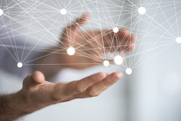 Transfer files data system relocation concept, Person hand using digital tablet waiting for transfer file process with loading bar icon on virtual screen.