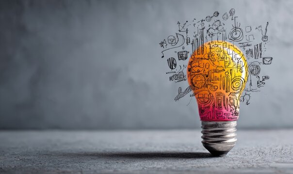 A gradient-colored lightbulb rests on a gray surface, emanating hand-drawn business-related sketches