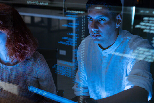 AI cyber security concept. Diverse IT specialist team analyzing artificial intelligence online risk threats to consumer data & privacy. Software developers coding & ethical hacking in dark office