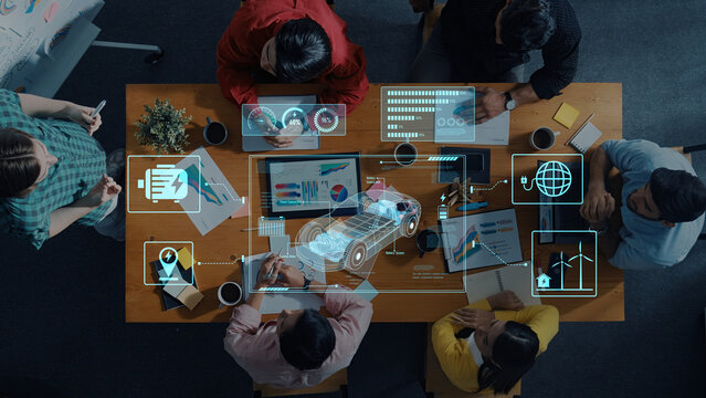 Aerial view of a diverse group of professionals collaborating in a modern workspace, utilizing technology and data visualization to enhance business decisions. Trope