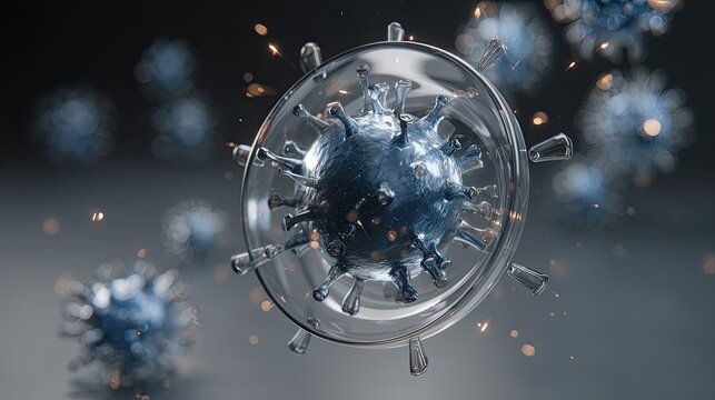 Virus structure with spiked proteins displayed against a light blue background illustrating microscopic biology during a scientific study