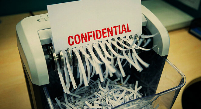 White shredded paper exits red office shredder machine. Important documents cut into strips for privacy protection. Action ensures secure info destruction, data confidentiality, preventing identity