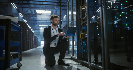 IT Engineer Holding Digital Tablet Analyzing Servers in Datacenter