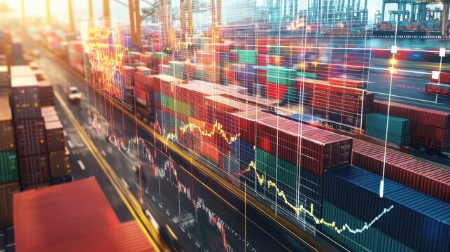 An aerial view of a busy shipping yard with colorful containers and data overlays showing trends and analytics, symbolizing logistics and trade.