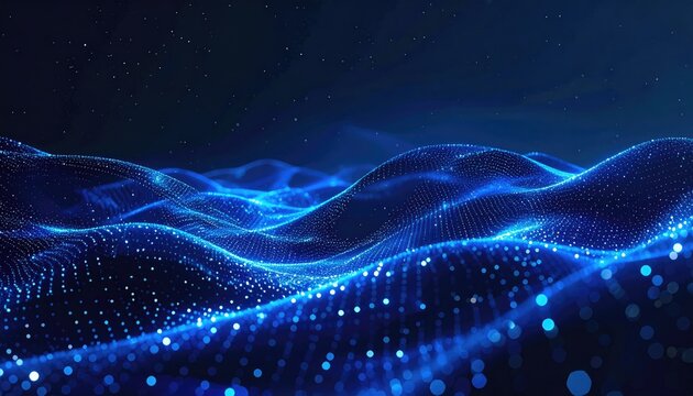 Wavy abstract terrain of glowing blue dots against a dark, star-filled backdrop
