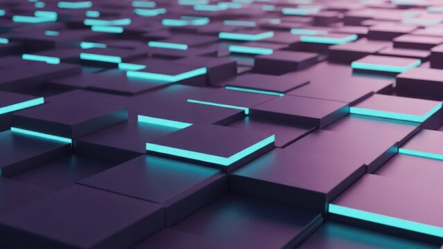 Abstract 3D rendering of square tiles with glowing turquoise edges, gradient color