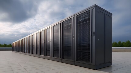 Modern server racks are lined up outdoors on a tiled platform under a dramatic cloudy sky symbolizing data infrastructure