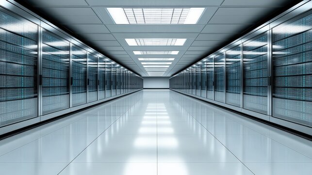 Modern data center corridor with rows of servers and bright overhead lighting reflecting on tiles