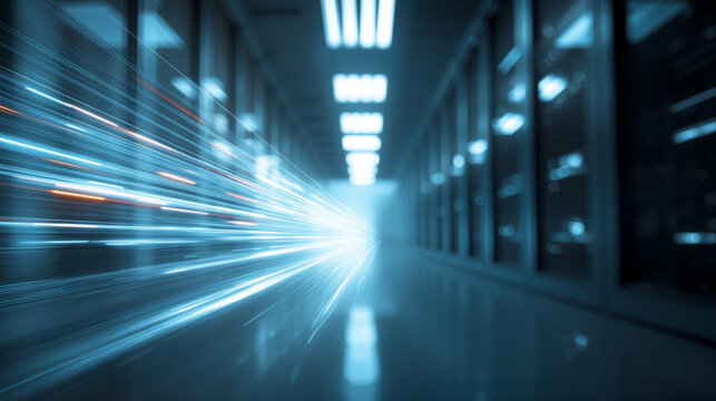 Data flow in a server room showcasing the speed and efficiency of modern technology during a busy processing period
