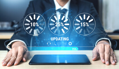 Businessman holding a futuristic progress bar and percentage indicator showing 70% update status