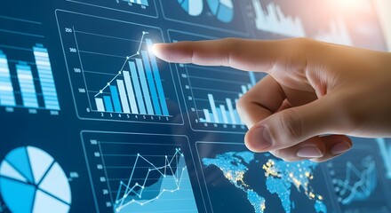 Analyzing business data analytics dashboard with hand touching graph chart screen view