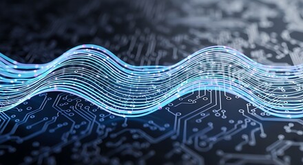 Abstract visualization of a digital data stream with glowing blue fiber optic cables forming a luminous wave over a circuit board