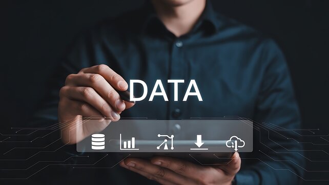 Harnessing Data Insights A Strategy for Business Success with Analytics and Technology Driven Solutions. Modern Business Strategy Hand Interact Data Overlays with Tech Background Digital Graph.