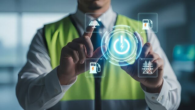 Engineer interacting with sustainable energy icons on interface