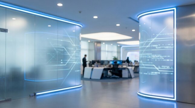 Futuristic office interior with neon lights and holographic displays, featuring quantum computing concepts and advanced technology