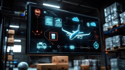 Cargo Management and Warehouse Scheduling Solutions concept. Futuristic display showing logistics and transportation data visualization.