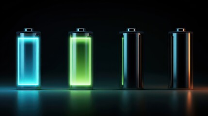 Colorful glowing battery indicators representing energy levels with vibrant lights on a dark background for technology and renewable energy themes